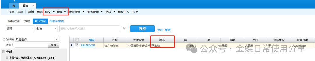 3.重算完成后保存報表,并將報表【提交】、【審核】,審核后報表的狀態(tài)從“在制”變?yōu)椤耙褜徍恕保?/span>
