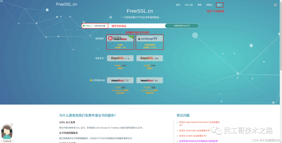 # 如何免費(fèi)申請(qǐng)Https證書這里介紹常用的四種免費(fèi)證書申請(qǐng)方式。 Let’s Encrypt官網(wǎng):https://letsencrypt.org/ Let’s Encrypt 是國(guó)外一個(gè)公共的免費(fèi) SSL 項(xiàng)目,由 Linux 基金會(huì)托管,它的來頭不小,由 Mozilla、思科、Akamai、IdenTrust 和 EFF 等組織發(fā)起,目的就是向網(wǎng)站自動(dòng)簽發(fā)和管理免費(fèi)證書,以便加速互聯(lián)網(wǎng)由 HTTP 過渡到 HTTPS。 Let’s Encrypt安裝部署簡(jiǎn)單、方便,目前Cpanel、Oneinstack等面板都已經(jīng)集成了Let’s Encrypt一鍵申請(qǐng)安裝,網(wǎng)上也有不少的利用Let’s Encrypt開源的特性制作的在線免費(fèi)SSL證書申請(qǐng)網(wǎng)站,總之Let’s Encrypt得到大家的認(rèn)可。 最后選擇Let’s Encrypt,一方面是Let’s Encrypt SSL已經(jīng)被Firefox、Chrome、IE等瀏覽器所支持。另一方面,Let’s Encrypt SSL證書下載和安裝已經(jīng)是傻瓜式的簡(jiǎn)單了。 申請(qǐng)教程官網(wǎng)使用教程:https://certbot.eff.org/ 在界面選擇部署到什么web服務(wù)上和操作系統(tǒng)是那款后,會(huì)自動(dòng)生成如何安裝和使用的步驟流程。 Cloudflare官網(wǎng):https://www.cloudflare.com/zh-cn/cloudflare是一家國(guó)外的 CDN 加速服務(wù)商,還是很有名氣的。提供免費(fèi)和付費(fèi)的加速和網(wǎng)站保護(hù)服務(wù)。cloudflare提供了不同類型的套餐,即使是免費(fèi)用戶,cloudflare 提供的功能也是很全面的。Cloudflare除了提供CDN,也提供免費(fèi)的SSL證書,使網(wǎng)站http變成https加密。Cloudflare一鍵設(shè)置ssl證書,操作簡(jiǎn)單,很多站長(zhǎng)都使用。CloudFlare提供的免費(fèi)SSL證書是UniversalSSL,即通用SSL,用戶無需向證書發(fā)放機(jī)構(gòu)申請(qǐng)和配置證書就可以使用的SSL證書,CloudFlare向所有用戶(包括免費(fèi)用戶)提供SSL加密功能。 不過Universal SSL的服務(wù)對(duì)免費(fèi)用戶有限制,CloudFlare只支持?jǐn)U展支持Server Name Indication(SNI)協(xié)議的現(xiàn)代瀏覽器,這意味著它不支持IE6及之前版本、運(yùn)行Android 2.2或更舊版本的Android瀏覽器。 test.org 并不是我擁有的域名,只是為了演示 隨便填寫的一個(gè)主域 cloudflare注冊(cè):https://dash.cloudflare.com/sign-up 添加站點(diǎn)(你的域名):添加網(wǎng)站,要填寫網(wǎng)站根域名,就是你購(gòu)買域名時(shí)的完整域名名稱(沒有添加任何前綴) 選擇那種套餐(個(gè)人使用推薦免費(fèi)開始) 它會(huì)讓你修改dns為CF所提供(就是你到域名服務(wù)商那取消掉dns解析,托管到CF 網(wǎng)站) 始終https(CF網(wǎng)站默認(rèn)有提供,但是未啟用,不想使用CF的可以上傳證書) FreeSSL官網(wǎng):https://freessl.cn/ 一個(gè)提供免費(fèi)HTTPS證書申請(qǐng)的網(wǎng)站,同一個(gè)域名只支持申請(qǐng)20個(gè) 申請(qǐng)教程準(zhǔn)備域名,選擇供應(yīng)商 填寫郵箱,選擇生成方式 域名提供商(云平臺(tái)DNS解析)處配置TXT記錄值 申請(qǐng)成工,下載證書?證書申請(qǐng)成功,我們可以看到,由于我們生成CSR的方式是離線生成,所以 FreeSSL 并沒有返回給您證書的私鑰,因?yàn)槟乃借€在 KeyManager 中,您只需要將證書保存到 KeyManager,KeyManager 會(huì)自動(dòng)為您進(jìn)行證書私鑰匹配,好,保存成功,這樣我們就成功申請(qǐng)了一張證書。 安裝使用(例如:nginx)FreeSSL官網(wǎng)提供安裝教程:https://blog.freessl.cn/how-do-i-install-an-ssl-certificate-collection/