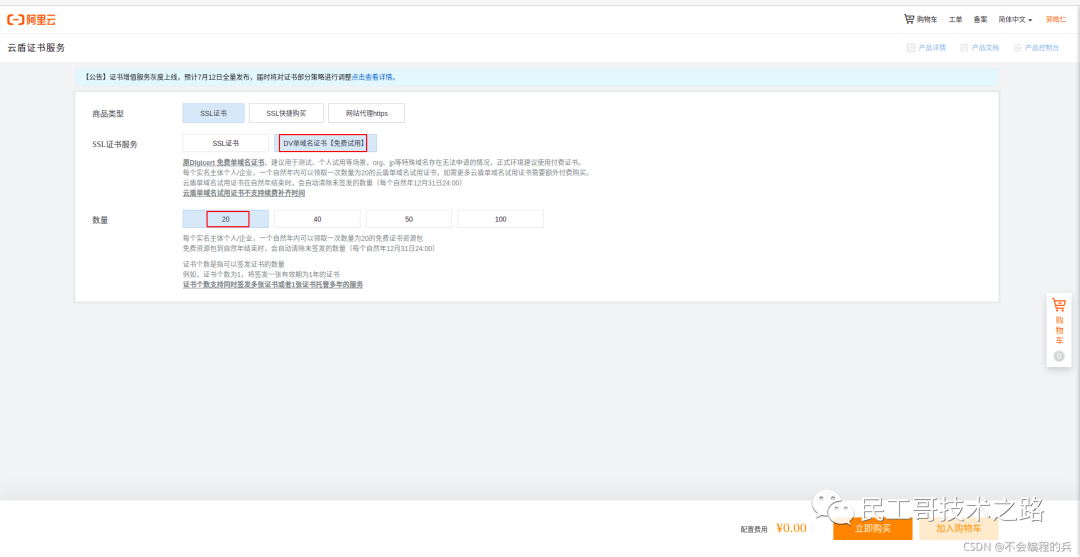 我這里已經(jīng)購(gòu)買過了,阿里云免費(fèi)證書 一個(gè)自然年只能買一次,一次有20個(gè)針對(duì)單個(gè)域名申請(qǐng)的機(jī)會(huì)