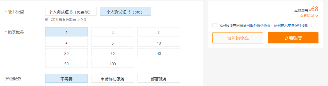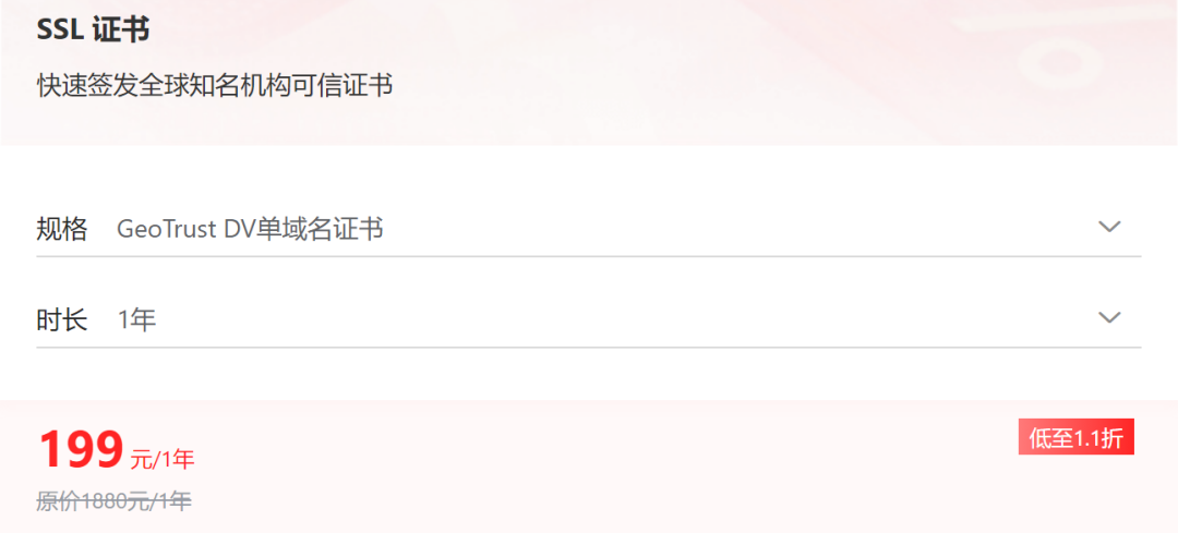 ?如果你不想使用免費(fèi)的,但是預(yù)算有限,不妨試試這幾款,價(jià)格都是從幾十元到三五百塊。特別適合個(gè)人或者初創(chuàng)小公司使用。阿里云之前介紹過,最便宜的個(gè)人版Pro數(shù)字證書地址68元1年,其次就是高性價(jià)比的DV型270.30元1年,這個(gè)價(jià)格還是很劃算的了。68元1年的在SSL控制臺(tái)選擇個(gè)人測(cè)試證書(原免費(fèi)證書)購(gòu)買,選擇個(gè)人測(cè)試證書(pro)。地址:https://t.aliyun.com/U/LGZcAR地址:https://curl.qcloud.com/VKvvWLja京東云的GeoTrust DV單域名證書價(jià)格199 元/1年,低至1.1折,性價(jià)比很高,個(gè)人站點(diǎn)或者是小程序APP部署HPPTS都是非常合適的。