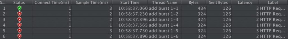 單個IP 10ms內并發(fā)發(fā)送6個請求,結果如下: 跟實例二相比,請求成功率沒變化,但是總體耗時變短了。這怎么解釋呢?實例二中,有4個請求被放到burst隊列當中,工作進程每隔500ms(rate=2r/s)取一個請求進行處理,最后一個請求要排隊2s才會被處理;實例三中,請求放入隊列跟實例二是一樣的,但不同的是,隊列中的請求同時具有了被處理的資格,所以實例三中的5個請求可以說是同時開始被處理的,花費時間自然變短了。 但是請注意,雖然設置burst和nodelay能夠降低突發(fā)請求的處理時間,但是長期來看并不會提高吞吐量的上限,長期吞吐量的上限是由rate決定的,因為nodelay只能保證burst的請求被立即處理,但Nginx會限制隊列元素釋放的速度,就像是限制了令牌桶中令牌產生的速度。 看到這里你可能會問,加入了nodelay參數之后的限速算法,到底算是哪一個“桶”,是漏桶算法還是令牌桶算法?當然還算是漏桶算法??紤]一種情況,令牌桶算法的token為耗盡時會怎么做呢?由于它有一個請求隊列,所以會把接下來的請求緩存下來,緩存多少受限于隊列大小。但此時緩存這些請求還有意義嗎?如果server已經過載,緩存隊列越來越長,RT越來越高,即使過了很久請求被處理了,對用戶來說也沒什么價值了。所以當token不夠用時,最明智的做法就是直接拒絕用戶的請求,這就成了漏桶算法。 示例四 自定義返回值