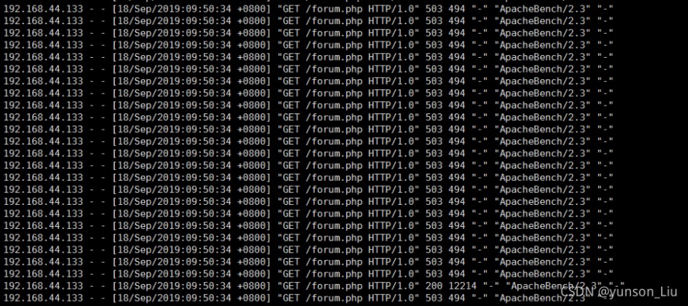 上述規(guī)則限制了每個IP訪問的速度為2r/s,并將該規(guī)則作用于根目錄。如果單個IP在非常短的時間內并發(fā)發(fā)送多個請求,結果會怎樣呢??? 監(jiān)測服務器nginx日志