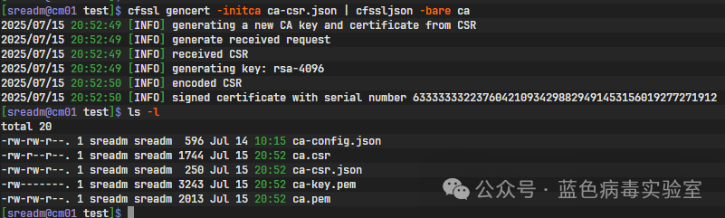 cfssl gencert -initca ca-crs.json | cfssljson -bare ca