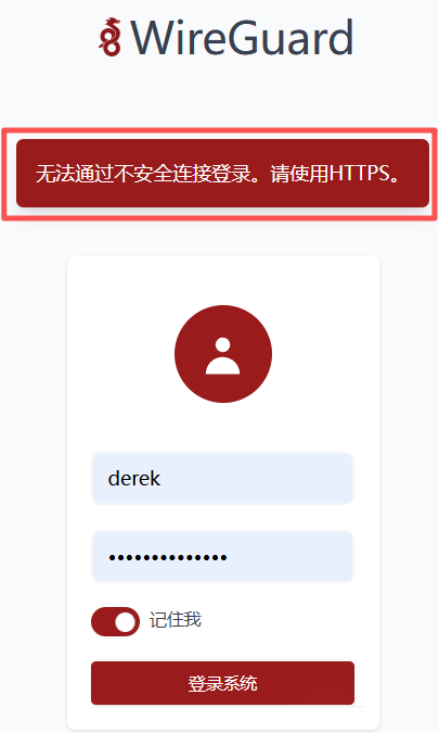 6??默認(rèn)wg-easy必須使用https登錄,可以配置環(huán)境變量- INSECURE=true來使用非安全的連接,配置后重啟生效。
