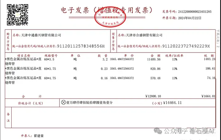 { "msgCode": 200, "msg": "返回成功!", "code": null, "number": "24122000000021651285", "date": "2024年04月22日", "checksum": null, "totalAmount": 14464.11, "totalAmountString": "壹萬肆仟肆佰陸拾肆圓壹角壹分", "taxAmount": 1664.01, "amount": 12800.10, "buyerName": "天津中通鼎興鋼管有限公司", "buyerCode": "91120112578348556H", "buyerAddress": null, "buyerAccount": null, "sellerName": "天津市合盛鋼管有限公司", "sellerCode": "91120223727492229X", "sellerAddress": null, "sellerAccount": null, "type": "增值稅專用發(fā)票", "detailList": [ { "name": "*黑色金屬冶煉壓延品*直縫焊管", "model": "60*3.5", "unit": "噸", "count": 3.2, "price": 3565.48672566372, "amount": 11409.56, "taxRate": 0.13, "taxAmount": 1483.24 }, { "name": "*黑色金屬冶煉壓延品*直縫焊管", "model": "60*3.75", "unit": "噸", "count": 0.23, "price": 3565.48672566372, "amount": 820.06, "taxRate": 0.13, "taxAmount": 106.61 }, { "name": "*黑色金屬冶煉壓延品*直縫焊管", "model": "60*4.75", "unit": "噸", "count": 0.16, "price": 3565.48672566372, "amount": 570.48, "taxRate": 0.13, "taxAmount": 74.16 } ]}