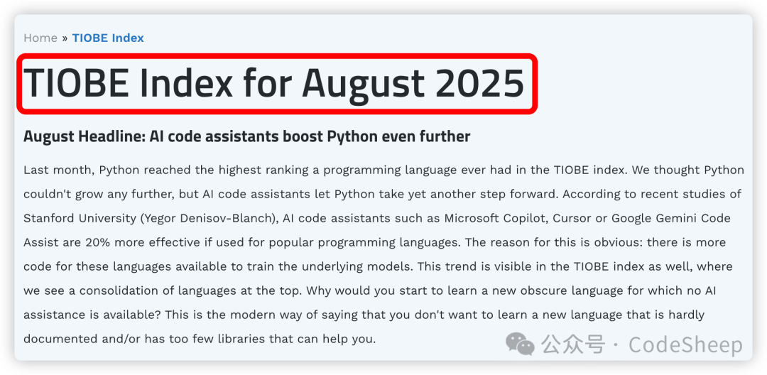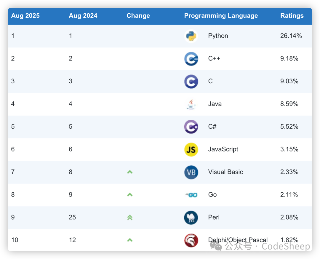 ![]() 其中 Python 可謂是一騎絕塵,與排名第二的 C++ 甚至拉開(kāi)了近 17% 的差距,呈現(xiàn)了斷崖式領(lǐng)先的格局。 不愧是 AI 領(lǐng)域當(dāng)仁不讓的“寵兒”,這勢(shì)頭其他編程語(yǔ)言簡(jiǎn)直是望塵莫及! 另外還值得一提的就是 C 語(yǔ)言。 最近這幾個(gè)月 C 語(yǔ)言的 TIOBE Index Ratings 比率一直在回升,這說(shuō)明其生命力還是非常繁榮的,這對(duì)于一個(gè)已經(jīng)誕生 50 多年的編程語(yǔ)言來(lái)說(shuō),著實(shí)不易。 C 語(yǔ)言于上個(gè)世紀(jì) 70 年代初誕生于貝爾實(shí)驗(yàn)室,由丹尼斯·里奇(Dennis MacAlistair Ritchie)以肯·湯普森(Kenneth Lane Thompson)所設(shè)計(jì)的 B 語(yǔ)言為基礎(chǔ)改進(jìn)發(fā)展而來(lái)的。 ![]() 就像之前 TIOBE 社區(qū)上所描述的,這可能主要和當(dāng)下物聯(lián)網(wǎng)(IoT)技術(shù)的發(fā)展繁榮,以及和當(dāng)今發(fā)布的大量小型智能設(shè)備有關(guān)。畢竟 C 語(yǔ)言運(yùn)行于這些對(duì)性能有著苛刻要求的小型設(shè)備時(shí),性能依然是最出色的。 說(shuō)到底,編程語(yǔ)言本身并沒(méi)有所謂的優(yōu)劣之分,只有合適的應(yīng)用場(chǎng)景與項(xiàng)目需求。 按照官方的說(shuō)法,TIOBE 榜單編程語(yǔ)言指數(shù)的計(jì)算和主流搜索引擎上不同編程語(yǔ)言的搜索命中數(shù)是有關(guān)的,所以某一程度上來(lái)說(shuō),可以反映出某個(gè)編程語(yǔ)言的熱門(mén)程度(流行程度、受關(guān)注程度)。 而通過(guò)觀察一個(gè)時(shí)間跨度范圍內(nèi)的 TIOBE 指數(shù)變化,則可以一定程度上看出某個(gè)編程語(yǔ)言的發(fā)展趨勢(shì),這對(duì)于學(xué)習(xí)者來(lái)說(shuō),可以作為一個(gè)參考。 Java:我啥場(chǎng)面沒(méi)見(jiàn)過(guò)![]() 曾經(jīng)的 Java 可謂是互聯(lián)網(wǎng)時(shí)代不可或缺的存在。早幾年的 Java 曲線一直處于高位游走,彼時(shí)的 Java 正是構(gòu)成當(dāng)下互聯(lián)網(wǎng)生態(tài)繁榮的重要編程語(yǔ)言,無(wú)數(shù)的 Web 后端、互聯(lián)網(wǎng)服務(wù),甚至是移動(dòng)端開(kāi)發(fā)等等都是 Java 的擅長(zhǎng)領(lǐng)域。 而如今隨著 AI 領(lǐng)域的發(fā)展和繁榮,曾經(jīng)的扛把子如今似乎也感受到了前所未有的壓力。 C語(yǔ)言:我厲兵秣馬![]() 流水的語(yǔ)言,鐵打的 C。 C 語(yǔ)言總是一個(gè)經(jīng)久不衰的經(jīng)典編程語(yǔ)言,同時(shí)也是為數(shù)不多總能闖進(jìn)榜單前三的經(jīng)典編程語(yǔ)言。 自誕生之日起,C 語(yǔ)言就憑借其靈活性、細(xì)粒度和高性能等特性獲得了無(wú)可替代的位置,就像上文說(shuō)的,隨著如今的萬(wàn)物互聯(lián)的物聯(lián)網(wǎng)(IoT)領(lǐng)域的興起,C 語(yǔ)言地位依然很穩(wěn)。 C++:我穩(wěn)中求進(jìn)![]() C++ 的確是一門(mén)強(qiáng)大的語(yǔ)言,但語(yǔ)言本身的包袱也的確是不小,而且最近這幾年的指數(shù)趨勢(shì)穩(wěn)中求進(jìn),加油吧老大哥。 Python:我逆流而上![]() 當(dāng)別的編程語(yǔ)言都在震蕩甚至下跌之時(shí),Python 這幾年卻強(qiáng)勢(shì)上揚(yáng),這主要和當(dāng)下的數(shù)據(jù)科學(xué)、機(jī)器學(xué)習(xí)、人工智能等科學(xué)領(lǐng)域的繁榮有著很大的關(guān)系。 PHP:我現(xiàn)在有點(diǎn)慌![]() PHP:我不管,我才是世界上最好的編程語(yǔ)言,不接受反駁 好了,那以上就是今天的內(nèi)容分享了,感謝大家的閱讀。 閱讀原文:點(diǎn)擊這里? 該文章在 2025/9/1 15:11:14 編輯過(guò) |