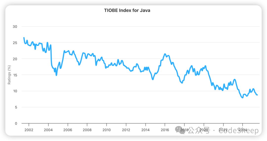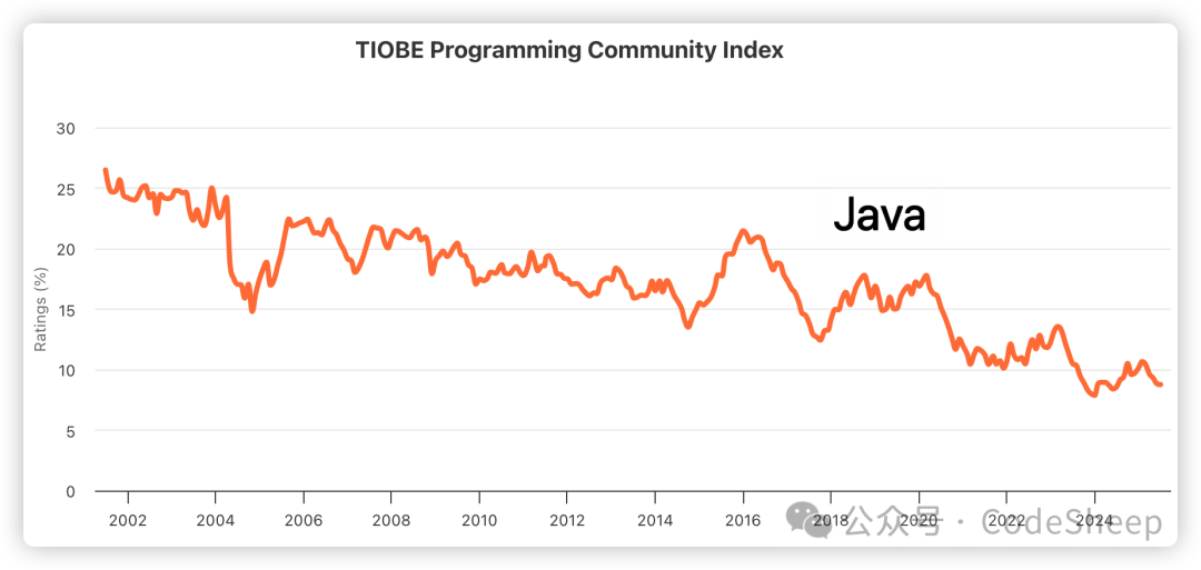 TIOBE 編程社區(qū)相信大家都聽(tīng)過(guò),這是一個(gè)查看各種編程語(yǔ)言流行程度和趨勢(shì)的社區(qū),每個(gè)月都有榜單更新,每年也會(huì)有年度榜單和總結(jié)出爐。 昨晚在家整理瀏覽器收藏夾時(shí),才想起了 TIOBE 社區(qū),于是打開(kāi)看了一眼最近的 TIOBE 編程語(yǔ)言社區(qū)指數(shù)。 ![]() 沒(méi)想到,Java 居然已經(jīng)跌出前三了,并且和第一名 Python 的差距也進(jìn)一步拉開(kāi)到了近 18%。 ![]() 回想起幾年前,Java 曾是何等地風(fēng)光。 各種基于 Java 技術(shù)棧所打造的 Web 后端、互聯(lián)網(wǎng)服務(wù)成為了移動(dòng)互聯(lián)網(wǎng)時(shí)代的中堅(jiān)力量,同時(shí)以 Java 開(kāi)發(fā)為主的后端崗位也是無(wú)數(shù)求職者們競(jìng)相選擇的目標(biāo)。 然而這才過(guò)去幾年,如今的 Java 似乎也沒(méi)有了當(dāng)年那種無(wú)與爭(zhēng)鋒的強(qiáng)勁勢(shì)頭,由此可見(jiàn) AI 領(lǐng)域的持續(xù)進(jìn)化和繁榮對(duì)它的沖擊到底有多大。 用數(shù)據(jù)說(shuō)話最有說(shuō)服力。 拉了一下最近這二十多年來(lái) Java 的 TIOBE 社區(qū)指數(shù)變化趨勢(shì)看了看,情況似乎不容客觀。 可以明顯看到的是一個(gè):呈震蕩式下降的趨勢(shì)。 ![]() 現(xiàn)如今,Java 日常跌出前三已經(jīng)成為了常態(tài),并且和常居榜首的 Python 的差距也是越拉越大了。 在目前最新發(fā)布的 TIOBE Index 榜單中排名前十的編程語(yǔ)言分別是: