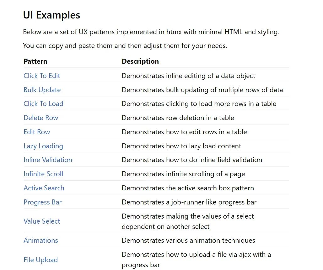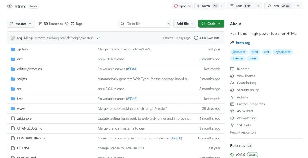 是一個非??岬那岸斯ぞ?,它讓你在純 HTML 中就能搞定 AJAX、CSS 過渡動畫、WebSocket、服務端發(fā)送事件(SSE)等交互功能——而且不需要寫一行 JavaScript。它體積超?。╣zip 后約 14 KB),無任何外部依賴,還非常容易擴展,說它是超能力的 HTML 工具箱一點也不夸張