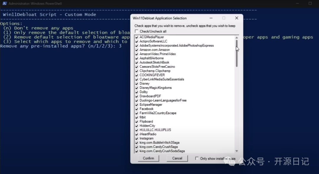 - 清理系統(tǒng)預(yù)裝應(yīng)用: 支持一鍵刪除大量微軟和第三方預(yù)安裝的應(yīng)用(如 Cortana、Bing AI、Xbox 控件、Candy Crush 等)。