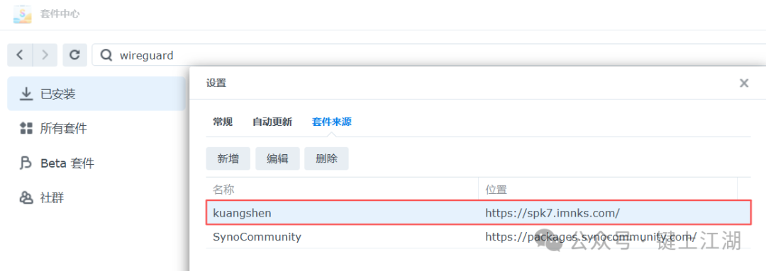 這樣宿主機(jī)訪問(wèn)群暉NAS IP 的時(shí)候,包就會(huì)送到容器里,由容器的 wg0 轉(zhuǎn)發(fā)。 (如果要永久生效,可以寫(xiě)到 /etc/network/interfaces 或者 systemd 的 network 配置里。) 四、群暉 NAS 安裝 WireGuard群暉系統(tǒng)默認(rèn)不支持 WireGuard,需要安裝依賴。 我嘗試用Docker安裝過(guò)wireguard鏡像,但由于的系統(tǒng)內(nèi)核版本是4.4不支持,所以選用第三方包安裝的方式來(lái)安裝wireguard。 通過(guò)第三方包安裝(適合DSM7)1、添加第三方套件源,搜索wireguard。