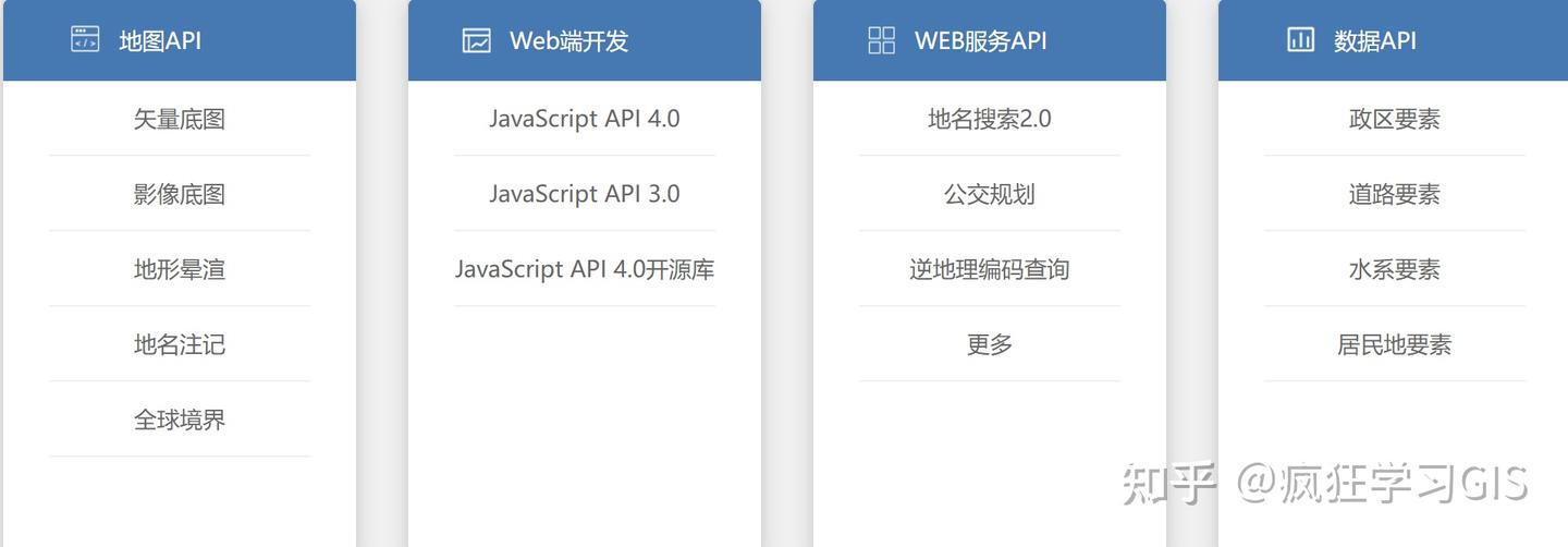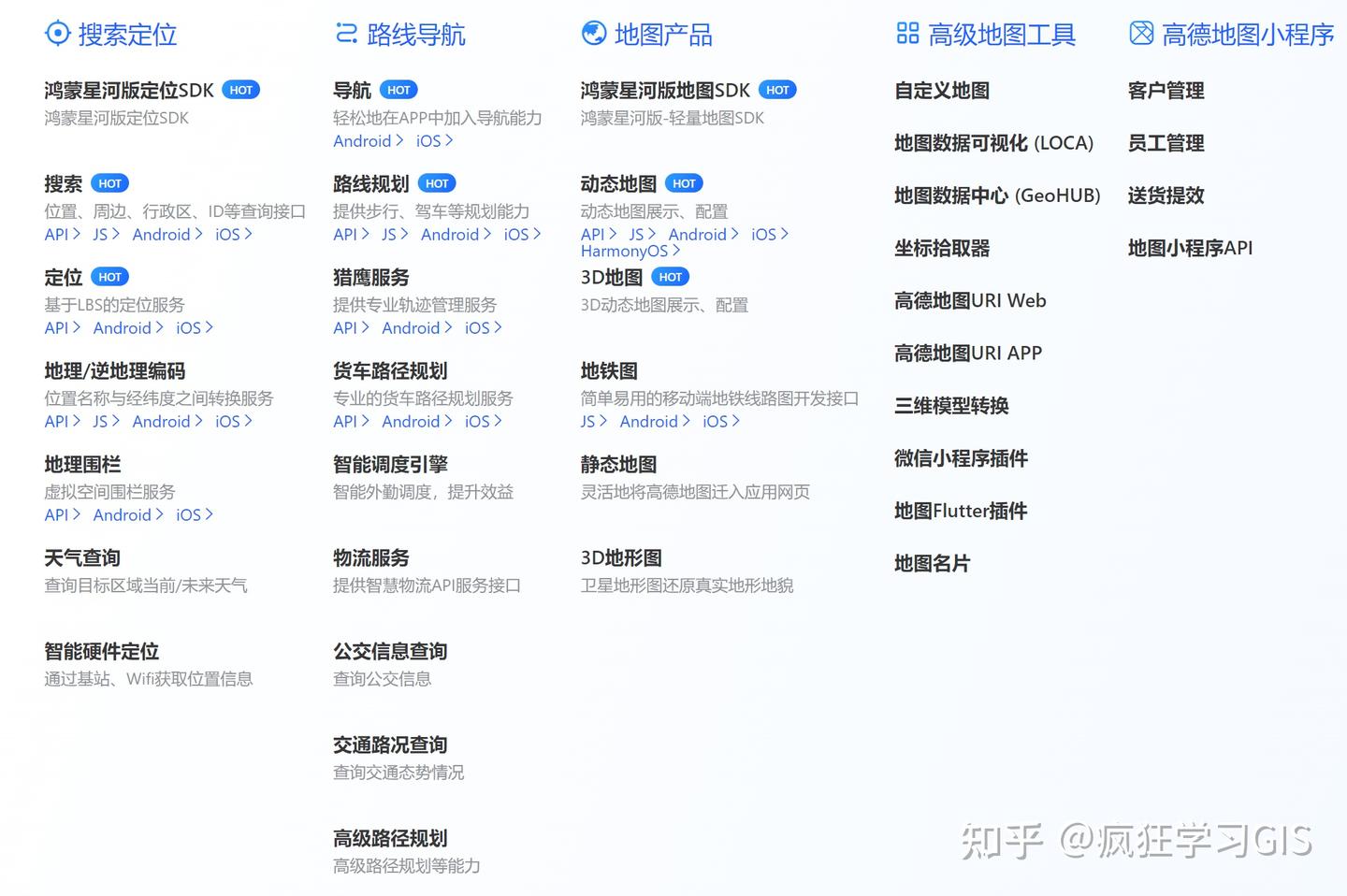 本文介紹高德、百度、騰訊、必應(yīng)與天地圖等 最近,一些工作需要用到地圖開(kāi)發(fā)API方面的內(nèi)容;在此之前,我還從來(lái)沒(méi)有接觸過(guò)地圖開(kāi)發(fā)相關(guān)API的知識(shí)與實(shí)踐,所以這里就對(duì)國(guó)內(nèi)開(kāi)發(fā)者常用的 1 高德地圖開(kāi)放平臺(tái)?1.1 功能其官網(wǎng)對(duì)各功能的展示如下。 ![]() 其中,包括以下常用功能。