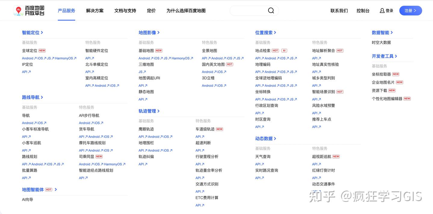 1.2 優(yōu)勢(shì)高德地圖開(kāi)放平臺(tái)是目前業(yè)內(nèi)使用最為廣泛的地圖API之一,也是一個(gè)開(kāi)發(fā)者使用起來(lái)體驗(yàn)感很好的API。無(wú)論是在地圖API的功能方面,還是各功能對(duì)應(yīng)的使用方法、接口文檔、幫助社區(qū)建設(shè)等方面,相對(duì)均較為成熟。 1.3 不足高德地圖的感興趣點(diǎn)(Point of Interest,POI)數(shù)量不足百度,在使用過(guò)程中會(huì)受到一定影響。 此外,國(guó)內(nèi)部分地圖開(kāi)發(fā)者論壇也有提到,高德地圖開(kāi)放平臺(tái)有時(shí)存在產(chǎn)品或服務(wù)規(guī)則短時(shí)間內(nèi)出現(xiàn)較大變化的情況——例如,突然強(qiáng)制為所有免費(fèi)用戶的地圖添加平臺(tái)水印、未提前通知而迅速關(guān)閉部分云服務(wù)導(dǎo)致開(kāi)發(fā)者長(zhǎng)期心血白費(fèi)需要重來(lái)等情況;這些亦需多加注意。 2 百度地圖開(kāi)放平臺(tái)?2.1 功能其官網(wǎng)對(duì)各功能的展示如下。 ![]() 可以看到,百度地圖開(kāi)放平臺(tái)的功能是幾家中最豐富的,提供了包括定位、導(dǎo)航、遙感數(shù)據(jù)、軌跡、位置搜索、動(dòng)態(tài)數(shù)據(jù)等地圖服務(wù)工具;且還提供了具有智能分析作用的時(shí)空大數(shù)據(jù)模塊、地圖智能體等,是幾家不同地圖API中,對(duì)時(shí)空智能分析、AI技術(shù)等最早加以應(yīng)用的廠商之一。總的來(lái)說(shuō),百度地圖開(kāi)放平臺(tái)對(duì)于開(kāi)發(fā)者而言可以說(shuō)滿足了幾乎全部的地圖服務(wù)需求。