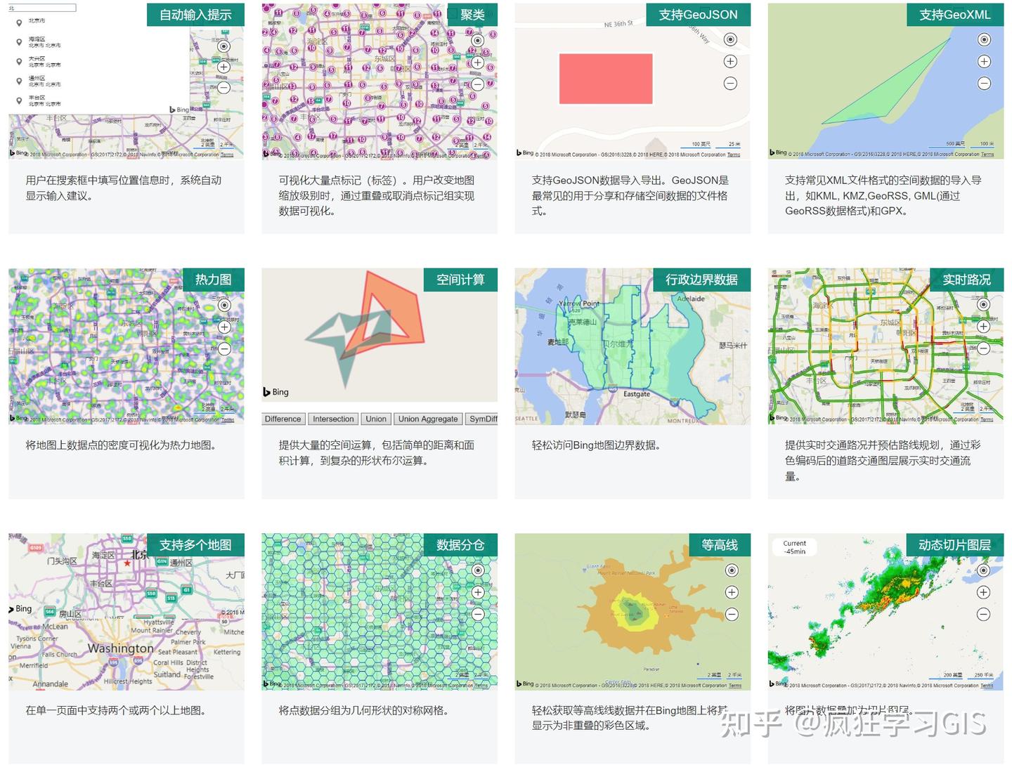 4.2 優(yōu)勢(shì)必應(yīng)地圖API我個(gè)人感覺(jué)其重心是在地圖數(shù)據(jù)分析上。其官網(wǎng)并沒(méi)有對(duì)定位、導(dǎo)航等基礎(chǔ)地圖應(yīng)用需求有過(guò)多介紹,反而是對(duì)熱力圖、空間計(jì)算、聚類(lèi)等空間分析算法加以一定篇幅的表述。對(duì)于需要涉及空間分析、地圖數(shù)據(jù)計(jì)算等的應(yīng)用需求,基于其API或許整體相對(duì)較為理想。 4.3 不足作為非國(guó)內(nèi)地圖API,不得不說(shuō)無(wú)法完全保證必應(yīng)地圖的各類(lèi)數(shù)據(jù)符合國(guó)內(nèi)相關(guān)規(guī)定——雖然他們?cè)趪?guó)內(nèi)亦有較大的to B用戶,按道理數(shù)據(jù)肯定也是符合審查規(guī)定的;但是相對(duì)而言,或許還是不如本文所列其他 而且整體來(lái)說(shuō),無(wú)論是從數(shù)據(jù)安全、服務(wù)質(zhì)量、接口穩(wěn)定性,還是國(guó)內(nèi)開(kāi)發(fā)者的應(yīng)用生態(tài)等不同角度考慮,對(duì)于當(dāng)前主要瞄向國(guó)內(nèi)市場(chǎng)的應(yīng)用、網(wǎng)頁(yè)而言,我感覺(jué)沒(méi)必要選擇國(guó)外的地圖API——即使真的有較多國(guó)外的地圖數(shù)據(jù)需求,那也可以通過(guò)百度的全球數(shù)據(jù)來(lái)實(shí)現(xiàn),沒(méi)必要因此直接使用國(guó)外圖商的數(shù)據(jù)。 5 天地圖API?5.1 功能其官網(wǎng)對(duì)各功能的展示如下。 ?其中,包括以下常用功能。