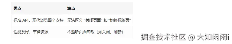 通過(guò)組合運(yùn)用上述 API,前端可以精準(zhǔn)捕獲用戶離開頁(yè)面的各類場(chǎng)景,在不影響性能的前提下實(shí)現(xiàn)智能化的用戶行為響應(yīng),為應(yīng)用體驗(yàn)優(yōu)化和數(shù)據(jù)采集提供可靠支撐。