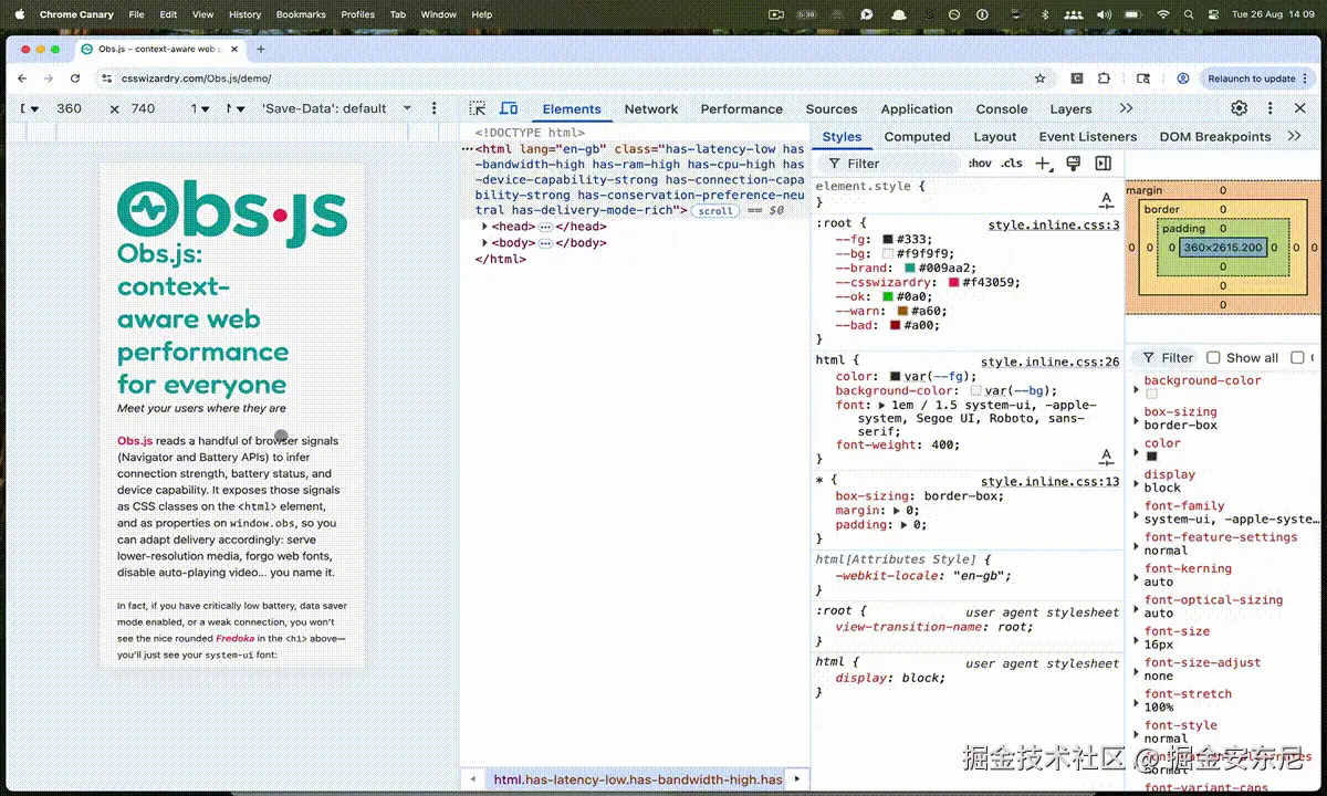 Obs.js 通過讀取少量的瀏覽器信號(Navigator 和 Battery API?),推斷出用戶的連接強度、電池狀態(tài)以及設備性能。它將這些信號以 CSS 類的形式添加到 <html> 元素上,并且以屬性的形式暴露在 window.obs 對象中,這樣您就可以據(jù)此靈活地調整資源交付策略,比如:提供低分辨率的媒體內(nèi)容、不使用網(wǎng)絡字體、禁用自動播放的視頻等等,您可以根據(jù)需要自由定制。