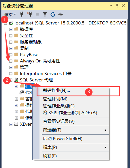 ?注意 對(duì)于SQL Server默認(rèn)實(shí)例,SQL Server服務(wù)的名稱為SQLSERVERAGENT。 對(duì)于命名了的實(shí)例,SQL Server代理服務(wù)名為SQLAgent$instancename。 在對(duì)代理有了一定了解后,再介紹一個(gè)例子,在代理中創(chuàng)建一個(gè)作業(yè),并添加一些腳本代碼。 三、創(chuàng)建并執(zhí)行作業(yè)本節(jié)講解如何在SQL Server Management Studio(SSMS)中創(chuàng)建一個(gè)SQL Server代理作業(yè),并在計(jì)劃中運(yùn)行它。(創(chuàng)建作業(yè)(包括其他組件,計(jì)劃、警報(bào)等等)的方式有很多,可以用SSMS圖形化操作,可以用Transact-SQL腳本操作,也可以用SQL Server Management Objects操作,這邊介紹SSMS圖形化操作,該方式比較通用直觀) 1. 創(chuàng)建作業(yè) 在SSMS中創(chuàng)建一個(gè)作業(yè),通常經(jīng)過(guò)以下幾步: