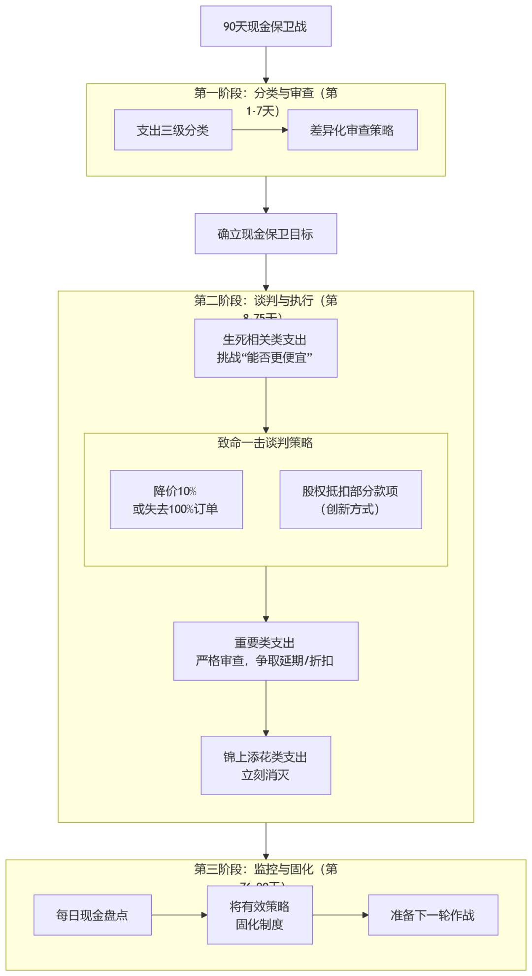 一、認(rèn)知革命——重新理解現(xiàn)金的暴政 在常態(tài)時期,現(xiàn)金是企業(yè)的血液;在寒冬期,現(xiàn)金就是企業(yè)唯一的氧氣。任何對現(xiàn)金的浪漫幻想,都會立刻轉(zhuǎn)化為葬送企業(yè)的致命毒藥。 軍規(guī)1:忘掉利潤,盯死現(xiàn)金流利潤是會計學(xué)的魔術(shù),現(xiàn)金流是戰(zhàn)場上的彈藥。無數(shù)公司死在賬面盈利但現(xiàn)金枯竭的悖論里。你必須建立每日現(xiàn)金流儀表盤,對未來90天的現(xiàn)金流入流出進行小時級監(jiān)控。某知名生鮮電商在瘋狂擴張時日均交易額破千萬卻一夜崩盤,原因就是將所有現(xiàn)金沉淀在了無法快速周轉(zhuǎn)的庫存上。 現(xiàn)金流量表生產(chǎn)模板示例 軍規(guī)2:假設(shè)融資永遠(yuǎn)關(guān)閉將生存希望寄托于下一輪融資,是最典型的絕望賭博。資本市場的冷酷超乎想象:90%的原定投資計劃會在市場轉(zhuǎn)向后瞬間蒸發(fā)。你必須立刻切換到“永遠(yuǎn)無外部輸血”模式,企業(yè)價值首先體現(xiàn)在自主造血能力而非估值泡沫上。 ? 軍規(guī)3:現(xiàn)金流速>利潤率周轉(zhuǎn)速度是生存的王道。哪怕毛利僅為1%,若能實現(xiàn)每日周轉(zhuǎn),年化回報也將驚人。反之,300%毛利的業(yè)務(wù)若需9個月回款,也足以拖垮任何企業(yè)。所有決策都需加入“周轉(zhuǎn)速度”權(quán)重,重新計算真實回報。 ![]() 表格:營業(yè)利潤率與現(xiàn)金流關(guān)系 軍規(guī)4:定義你公司的“北極星現(xiàn)金指標(biāo)”忘掉GMV、用戶量這些虛榮指標(biāo)。你的公司必須有一個且唯一的核心現(xiàn)金指標(biāo):可能是“經(jīng)營性凈現(xiàn)金流回正天數(shù)”、“現(xiàn)金周轉(zhuǎn)周期”或“單位現(xiàn)金產(chǎn)出效率”。讓全公司為這個數(shù)字癲狂。 軍規(guī)5:建立“現(xiàn)金暴政”文化從上至下灌輸“每分錢都是救命錢”的極端理念。CEO應(yīng)親自審批每一筆超過萬元支出,公開表彰現(xiàn)金節(jié)約典范,嚴(yán)厲懲罰無謂浪費。文化的形成需要極端事件,必要時可設(shè)計“現(xiàn)金斷裂壓力測試”讓全員感受窒息感。 認(rèn)知的重塑是生存的前提——只有當(dāng)你真正嗅到現(xiàn)金枯竭帶來的死亡氣息,才會爆發(fā)求生的全部潛能。 二、極限求生——止血、續(xù)命、囤糧 認(rèn)知轉(zhuǎn)變必須立刻轉(zhuǎn)化為殘酷行動。寒冬中沒有“過渡期”,任何猶豫都是在消耗最后的氧氣。 軍規(guī)6:啟動“魔鬼式”現(xiàn)金流壓力測試極端假設(shè):若收入歸零,你的現(xiàn)金能活多久?立即測算:砍掉所有非核心業(yè)務(wù),退租所有非必需場地,遣散所有非關(guān)鍵人員后,現(xiàn)金流如何?這不是悲觀,而是理性。某線下教育巨頭在“雙減”前半年做過此測試,隨后果斷關(guān)閉30%門店、轉(zhuǎn)型輕資產(chǎn)模式,最終成為行業(yè)洗牌后極少數(shù)的存活者。 ![]() 軍規(guī)7:90天現(xiàn)金保衛(wèi)戰(zhàn)將所有支出分類為“生死相關(guān)”、“重要”、“錦上添花”。立刻消滅第三類,嚴(yán)格審查第二類,即便是第一類也要挑戰(zhàn)“能否更便宜”?談判策略:對供應(yīng)商直言“降價10%或失去我們100%訂單”,通常有效;甚至可嘗試“用股權(quán)抵扣部分款項”的創(chuàng)新方式。 ![]() 支出分類與審查策略 軍規(guī)8:庫存清零閃電戰(zhàn)庫存是沉默的現(xiàn)金殺手。立即啟動:①折扣閃電戰(zhàn)快速變現(xiàn);②庫存互換(與無競爭關(guān)系公司交換所需物資);③預(yù)售+反向定制(先收錢再采購)。服裝企業(yè)Shein的極致柔性供應(yīng)鏈讓其庫存周轉(zhuǎn)天數(shù)僅為行業(yè)1/10,這才是其逆勢增長的真相。 軍規(guī)9:應(yīng)收賬款的“嗜血追殺”將回款提升至戰(zhàn)略高度:①成立CEO牽頭的回款特戰(zhàn)隊;②設(shè)計“早回款高折扣、晚回款付罰息”的階梯方案;③啟用律師函、供應(yīng)鏈金融保理等強硬手段。記?。?/span>逾期賬款超過180天,回收率直降至50%以下。 ![]() 軍規(guī)10:開發(fā)“現(xiàn)金冗余”的變態(tài)愛好設(shè)定絕對紅線:無論何種情況,賬上必須保留“無法觸碰”的保命現(xiàn)金(覆蓋6個月固定成本)。將此現(xiàn)金加密隔離,即便CEO本人也無法單人動用。冗余現(xiàn)金是絕望深淵上的最后纜繩。 極限求生不是悲觀主義,而是最理性的樂觀主義——只有活下來,才有資格看到下一個春天。 三、反向進攻——寒冬下的閃電擴張 真正頂尖的玩家,從不滿足于生存。它們利用寒冬提供的戰(zhàn)略機遇,反向進攻,實現(xiàn)逆勢擴張。 軍規(guī)11:抄底人才“狙擊手計劃”行業(yè)低迷時,頂尖人才更易獲得且成本更低。列出你夢寐以求的“狙擊名單”,用“現(xiàn)金+股權(quán)”的組合方案精準(zhǔn)獵殺。 Airbnb在2008年金融危機時逆勢招募大量設(shè)計師和工程師,這批人奠定了其日后顛覆酒店業(yè)的產(chǎn)品基礎(chǔ)。 軍規(guī)12:發(fā)起“掠奪性”并購現(xiàn)金流充沛的你已成為獵食者。密切關(guān)注那些技術(shù)先進但現(xiàn)金流斷裂的競爭對手,用現(xiàn)金低價收購其核心資產(chǎn)、技術(shù)專利或客戶清單。此舉既消滅潛在威脅,又強化自身。注意:只并購資產(chǎn),而非公司實體(避免債務(wù)陷阱)。 軍規(guī)13:用現(xiàn)金流重構(gòu)產(chǎn)品矩陣將業(yè)務(wù)分為三類: