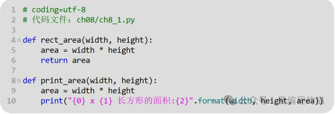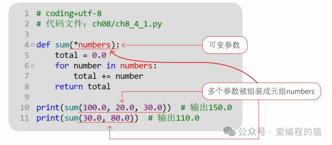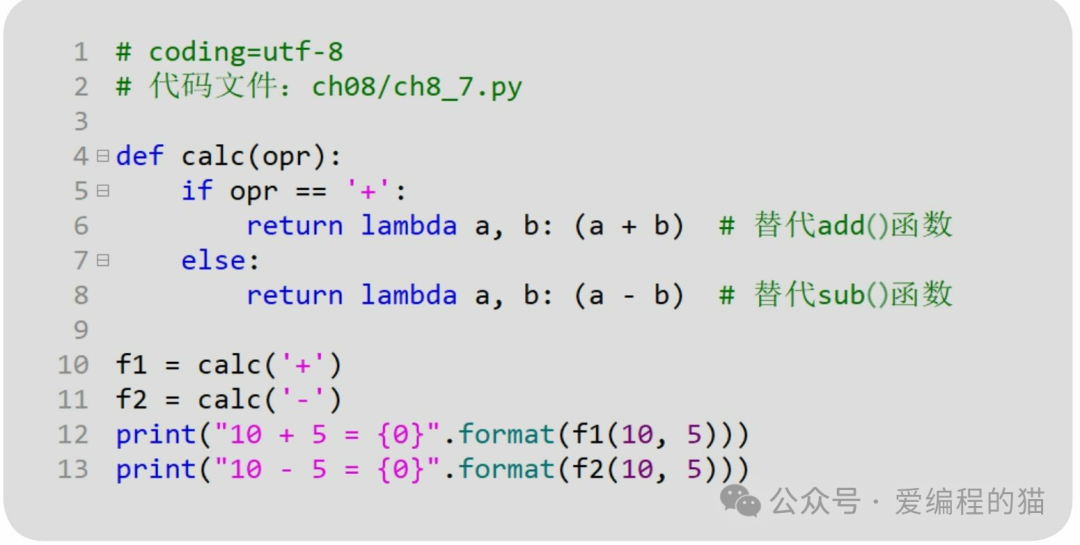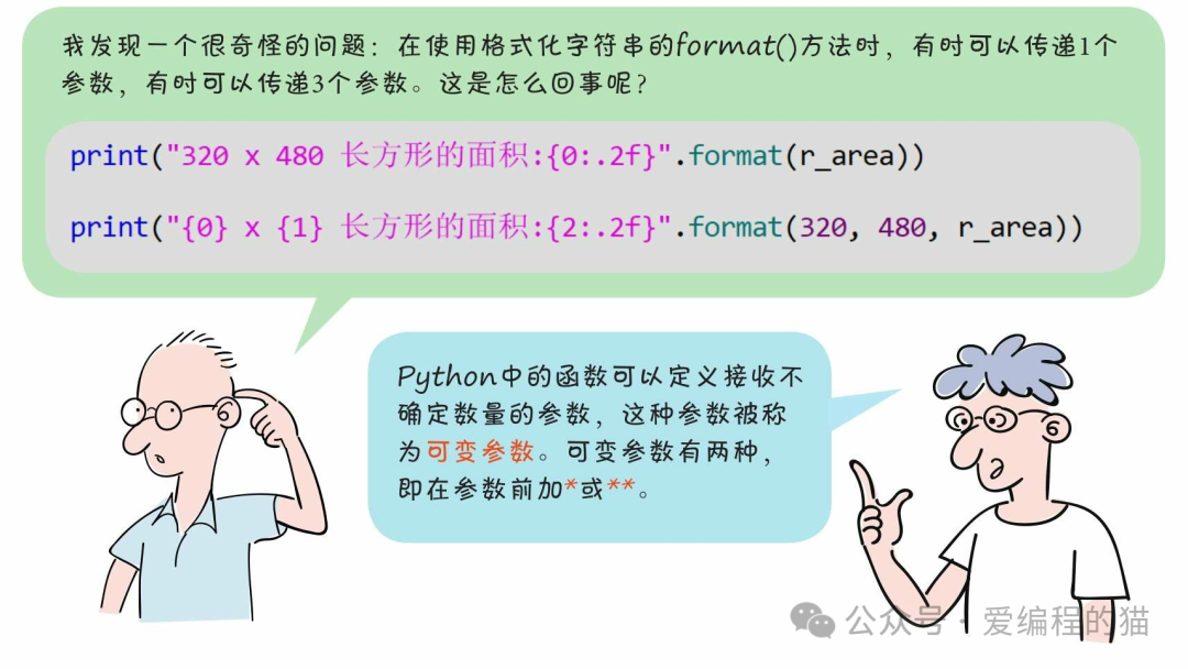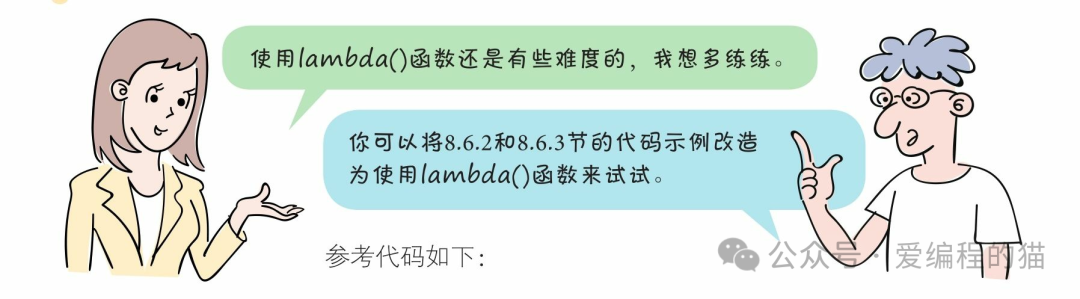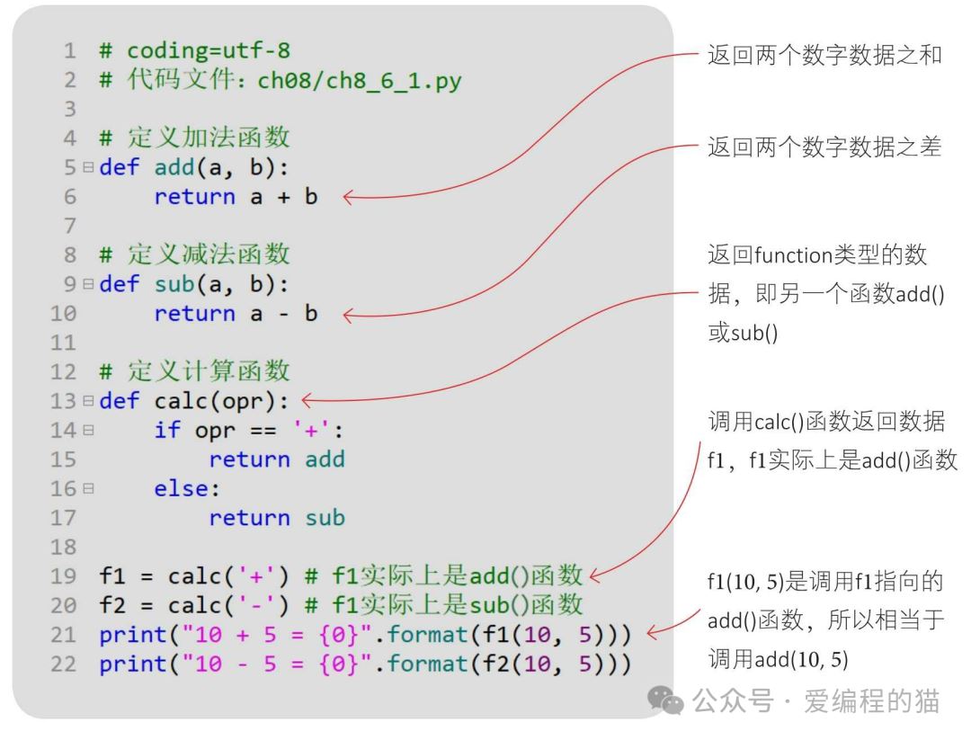 導讀 簡要介紹:本文改編知名作家-關東升,一個在IT領域摸爬滾打20多年的老程序員、軟件架構師、高級培訓 講師、IT作家。 ? ![]() ![]() ![]() ![]() ![]() 在定義好函數(shù)后,就可以調用函數(shù)了,很簡單! 8.2.1 使用位置參數(shù)調用函數(shù) 在調用函數(shù)時傳遞的實參與定義函數(shù)時的形參順序一致,這是調用 函數(shù)的基本形式。 ![]() ![]() 在調用函數(shù)時可以采用“關鍵字=實參”的形式,其中,關鍵字的名稱就是定義函數(shù)時形參的名稱。 ![]() ![]() ![]() ![]() ![]() 8.4.1 基于元組的可變參數(shù)(*可變參數(shù)) *可變參數(shù)在函數(shù)中被組裝成一個元組。 示例代碼如下: ![]() 8.4.2 基于字典的可變參數(shù)(**可變參數(shù)) **可變參數(shù)在函數(shù)中被組裝成一個字典。 示例代碼如下: ![]() ![]() ![]() ![]() ![]() ![]() ![]() ![]() ![]() Python中的任意一個函數(shù)都有數(shù)據(jù)類型,這種數(shù)據(jù)類型是function, 被稱為函數(shù)類型。 8.6.1 理解函數(shù)類型 函數(shù)類型的數(shù)據(jù)與其他類型的數(shù)據(jù)是一樣的,任意類型的數(shù)據(jù)都可 以作為函數(shù)返回值使用,還可以作為函數(shù)參數(shù)使用。因此,一個函數(shù)可 以作為另一個函數(shù)返回值使用,也可以作為另一個函數(shù)參數(shù)使用。 ![]() ![]() ![]() ![]() ![]() add()和sub()函數(shù)有兩個數(shù)字參數(shù),具有相同的函數(shù)類型。sq uare()函數(shù)只有一個數(shù)字參數(shù),所以square()與add()、sub()函 數(shù)的類型不同。 8.6.2 過濾函數(shù)filter() 在Python中定義了一些用于數(shù)據(jù)處理的函數(shù),如filter()和map( )等。我們先介紹filter()函數(shù)。 filter()函數(shù)用于對容器中的元素進行過濾處理。 ![]() ![]() 參數(shù)function是一個提供過濾條件的函數(shù),返回布爾值。 參數(shù)iterable是容器類型的數(shù)據(jù)。 ![]() ![]() ![]() ![]() 8.6.3 映射函數(shù)map() map()函數(shù)用于對容器中的元素進行映射(或變換)。 例如:我 想將列表中的所有元素都乘以2,返回新的列表。 ![]() ![]() 參數(shù)function是一個提供變換規(guī)則的函數(shù),返回變換之后的元素。 參數(shù)iterable是容器類型的數(shù)據(jù)。 示例代碼如下: ![]() ![]() ![]() 我們之前學習的函數(shù)都是有名稱的函數(shù),例如在8.1節(jié)定義的rect_ar ea()函數(shù),rect_area就是其函數(shù)名。我們也可以定義匿名函數(shù),匿名 函數(shù)就是沒有名稱的函數(shù)。 在Python中使用lambda關鍵字定義匿名函數(shù)。lambda關鍵字定義的 函數(shù)也被稱為lambda()函數(shù),定義lambda()函數(shù)的語法如下。 “參數(shù)列表”與函數(shù)的參數(shù)列表是一樣的,但不需要用小括號括起來。 ![]() ![]() lambda()函數(shù)與有名稱的函數(shù)一樣,都是函數(shù)類型,所以8.6.1節(jié) 的add()和sub()函數(shù)可以被lambda()函數(shù)替代。修改8.6.1節(jié)的代 碼示例如下: ![]() ![]() ![]() ![]() ![]() 閱讀原文:https://mp.weixin.qq.com/s/COv9z89qukquBocw7IcAvA 該文章在 2025/9/17 12:48:37 編輯過 |