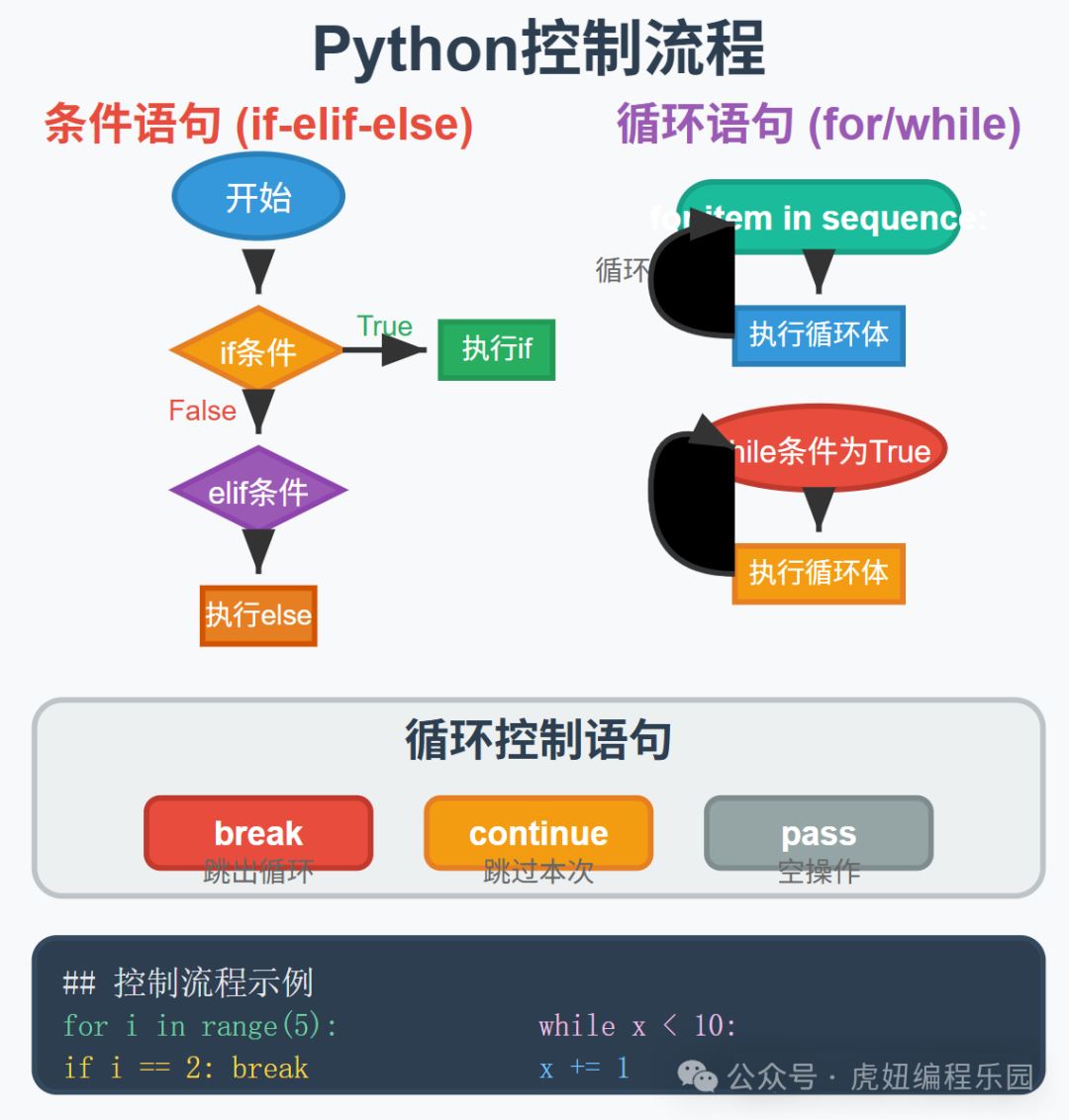 運算符:數(shù)學(xué)不好也能懂 ![]() Python中的運算符就像計算器上的按鍵,幫你做各種計算: 算術(shù)運算符:加減乘除這些 比較運算符:比較大小關(guān)系 邏輯運算符:并且、或者、非的關(guān)系 控制流程:讓程序有“腦子” ![]() 程序不只能按順序執(zhí)行,還能根據(jù)條件做決定! 條件語句:如果...就... 這段代碼的意思是:如果分?jǐn)?shù)大于等于90,等級是A;否則如果大于等于80,等級是B;否則就是C。 注意哦,Python是用縮進(jìn)來表示代碼塊的,一般是4個空格。這是Python的特色,也讓代碼看起來更整齊。 循環(huán)語句:重復(fù)的事情交給計算機 for循環(huán):適合知道次數(shù)的循環(huán) 這會打印出0到4五個數(shù)字。 while循環(huán):適合不知道次數(shù)但知道條件的循環(huán) 這段代碼會一直執(zhí)行,直到count不小于3為止。 函數(shù):一勞永逸的智慧 ![]() 如果你有一段代碼需要反復(fù)使用,那就把它寫成函數(shù)吧! 函數(shù)可以有參數(shù),也可以有默認(rèn)值(比如上面的greeting="Hello")。這樣你只需要寫一次代碼,就可以多次使用。 數(shù)據(jù)結(jié)構(gòu):數(shù)據(jù)的組織方式 ![]() Python提供了幾種數(shù)據(jù)結(jié)構(gòu),就像不同的收納工具: 列表(list):像購物清單,可以隨時增刪改 元組(tuple):像一次性打包的快遞,不能更改內(nèi)容 字典(dict):像真實的字典,通過關(guān)鍵詞查找解釋 集合(set):像數(shù)學(xué)中的集合,自動去重 異常處理:給程序上個保險 程序運行時難免會出錯,好的程序應(yīng)該能優(yōu)雅地處理錯誤: 這樣即使用戶輸入了錯誤的數(shù)據(jù),程序也不會崩潰,而是給出友好的提示。 模塊與包:站在巨人的肩膀上 Python最強大的地方在于有大量現(xiàn)成的模塊可以直接使用: 除了Python自帶的標(biāo)準(zhǔn)庫,還有成千上萬的第三方庫可以通過pip安裝,比如: