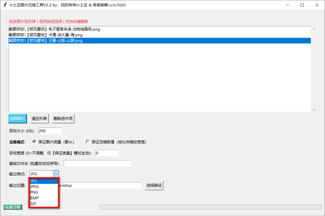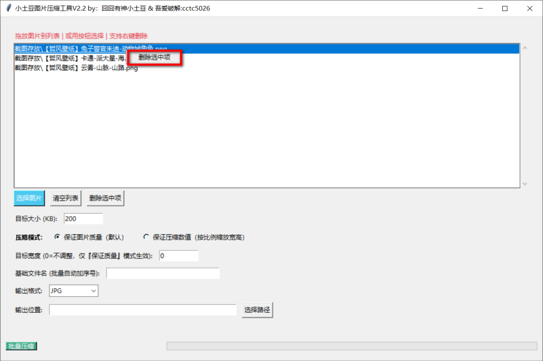 右鍵可以刪除選中項(xiàng),支持自定義輸出路徑,提供保證圖片質(zhì)量和保證壓縮數(shù)值兩種壓縮模式,支持多種輸出格式選擇。