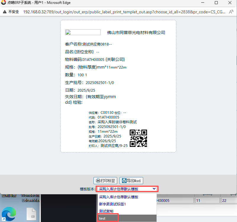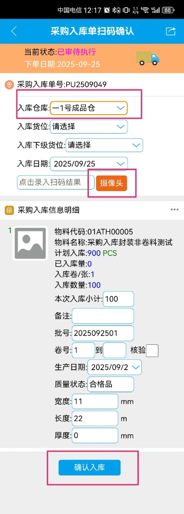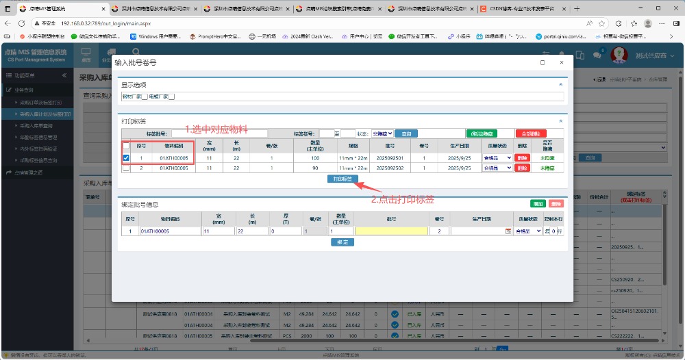 ![]() 4.然后退出當(dāng)前系統(tǒng)的賬號(hào),登錄供應(yīng)商賬號(hào)。 5.進(jìn)入系統(tǒng)之后,在左側(cè)功能菜單里點(diǎn)擊“采購入庫計(jì)劃及標(biāo)簽打印” 6.進(jìn)入界面后,點(diǎn)擊查詢,然后找到對(duì)應(yīng)入庫單點(diǎn)擊并拉到最右邊雙擊打印標(biāo)簽,會(huì)彈出信息窗口。 在彈出的信息窗口內(nèi),填寫數(shù)量和日期。如果有多物料的話可以在右邊點(diǎn)擊增加,然后點(diǎn)擊綁定。 綁定之后,在頁面內(nèi)左手邊選好對(duì)應(yīng)物料進(jìn)行勾上,點(diǎn)擊打印標(biāo)簽。 7.在二維碼標(biāo)簽界面內(nèi),模板選擇“test”,點(diǎn)擊打印標(biāo)簽。然后就會(huì)彈出打印預(yù)覽界面。 ![]() 8.進(jìn)入到打印預(yù)覽頁面后,在手機(jī)打開“點(diǎn)晴業(yè)務(wù)通app”,點(diǎn)擊“按采購入庫單掃碼確認(rèn)” 9.手機(jī)點(diǎn)擊“按采購入庫單掃碼確認(rèn)”進(jìn)去后,點(diǎn)擊“攝像頭”,對(duì)剛才的打印預(yù)覽界面內(nèi)的二維碼進(jìn)行掃碼操作。 然后手機(jī)app內(nèi)下方就會(huì)顯示采購入庫信息明細(xì),接著要記得選擇入庫倉庫,最后點(diǎn)擊確認(rèn)入庫。 10.回到“采購入庫計(jì)劃及打印標(biāo)簽”頁面,再次點(diǎn)擊查詢,可以看到剛才掃碼的物料已經(jīng)成功入庫了。 點(diǎn)晴模切ERP更多信息:http://moqie.clicksun.cn,聯(lián)系電話:4001861886 該文章在 2025/9/25 15:45:50 編輯過 |