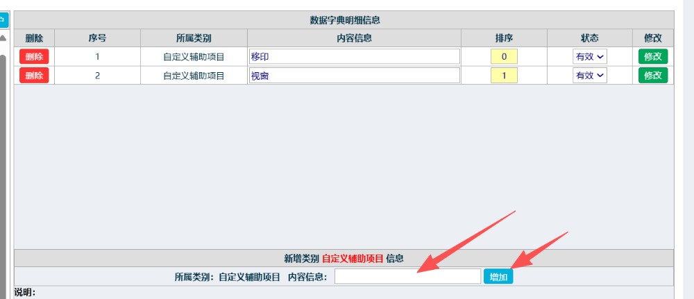 ? ![]() ![]() 操作步驟:ERP-系統(tǒng)管理-數(shù)據(jù)字典維護(hù),如下圖: 進(jìn)入界面后,點(diǎn)擊“自定義輔助項(xiàng)目” 輸入自定義的項(xiàng)目?jī)?nèi)容,點(diǎn)擊添加即可,如下圖所示: ![]() 點(diǎn)晴模切ERP更多信息:http://moqie.clicksun.cn,聯(lián)系電話:4001861886 該文章在 2025/10/11 16:32:48 編輯過 |