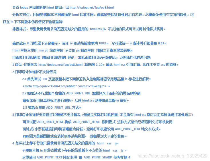 這是我懷疑起了C-Lodop這個打印控件,查看該官網(wǎng)發(fā)現(xiàn),Lodop調(diào)用ie引擎進(jìn)行解析超文本,但是客戶端ie版本可能不同,或ie本身存在問題,都會影響解析后的樣式是,升級ie瀏覽器