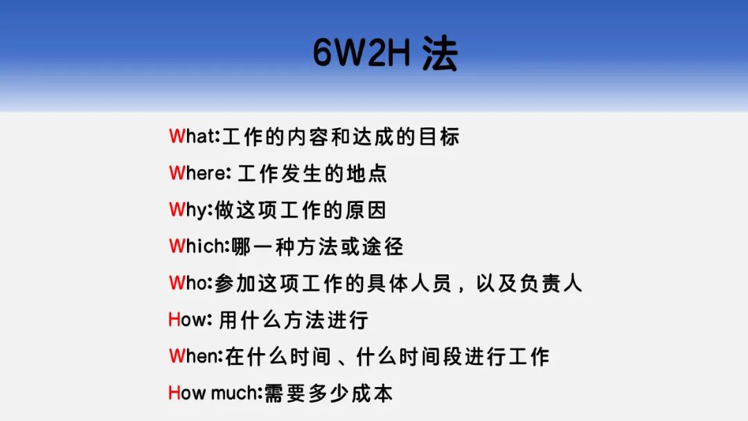 6W2H 是解決問題時(shí)的一張“提問清單”,包含八個(gè)要素: