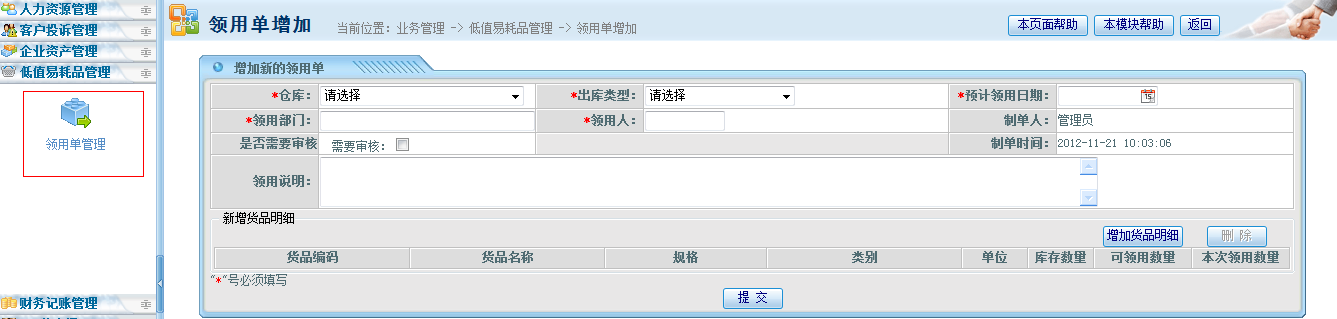 [p] 領(lǐng)用單中的 “領(lǐng)用部門”可否改為 選擇呢?或者是 默認(rèn)本員工號所在的部門;[/p]