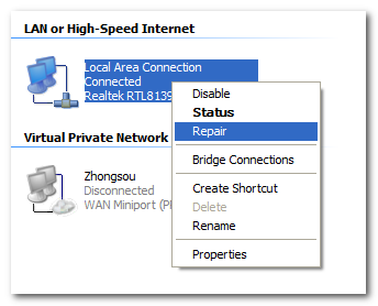 圖一 但是有時(shí)候這樣做還是無法清除DNS緩存,我們還可以這樣來清除DNS緩存: 控制面板 - 網(wǎng)絡(luò)連接 - 在"本地連接"上右鍵單擊,選擇‘修復(fù)’,如圖二