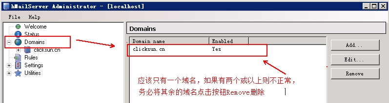 然后輸入密碼:clicksun2010,進入點晴OA的Email后臺管理程序,點擊Domains,檢查是否存在兩個或以上Email域名,正常情況下應該只有一個,如果有多個,則務必將其余域名刪除,只保留正在使用的這個域名:
