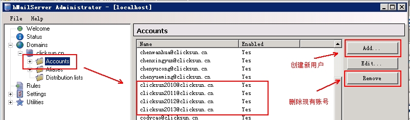 然后點擊Accounts,將 clicksun2010 ~ clicksun2013 四個Email賬號全部刪除,然后重新創(chuàng)建這四個賬號: 至此,應該可以將郵件保存到發(fā)件箱和草稿箱了。 該文章在 2014/12/19 11:31:05 編輯過 |