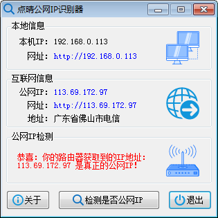 ![]() ![]() 提示1:“恭喜:你的路由器獲取到的IP是真正的公網(wǎng)IP”,這種情況真是可喜可賀,在路由器上做一個(gè)簡(jiǎn)單的端口轉(zhuǎn)向設(shè)置,就可以簡(jiǎn)單的實(shí)現(xiàn)外網(wǎng)訪問局域網(wǎng)內(nèi)的服務(wù)器了,不需要其他操作或費(fèi)用。注意,如果本單位沒有特別向?qū)拵Х?wù)商付費(fèi)購(gòu)買固定IP(對(duì)應(yīng)上述上網(wǎng)方式1),那么路由器獲得IP就肯定是動(dòng)態(tài)公網(wǎng)IP,每次路由器斷開重新連接后獲得公網(wǎng)IP都會(huì)改變(對(duì)應(yīng)上述上網(wǎng)方式2)。