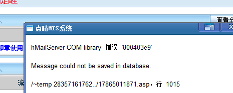 點(diǎn)晴永久免費(fèi)OA發(fā)送郵件或?qū)徍斯ぷ髁魈峤粫r(shí)報(bào)錯(cuò):hMailServer_COM_library錯(cuò)誤800403e9,Message could not be saved in database.如何解決?