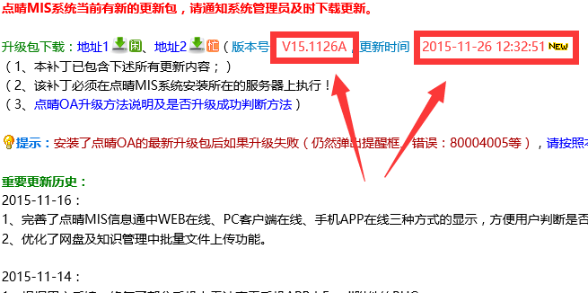 http://update.oa22.cn 由于點(diǎn)晴OA系統(tǒng)的安裝程序制作比較麻煩、而升級(jí)包的制作則十分簡(jiǎn)單方便,正常情況下,一般點(diǎn)晴OA安裝程序一年只更新1~2次,所以用戶安裝的點(diǎn)晴OA正常情況下并不是最新版本。管理員安裝點(diǎn)晴OA系統(tǒng)完畢后,應(yīng)該立即在OA服務(wù)器上下載以下最新版升級(jí)包,將點(diǎn)晴OA服務(wù)器升級(jí)到最新版本。