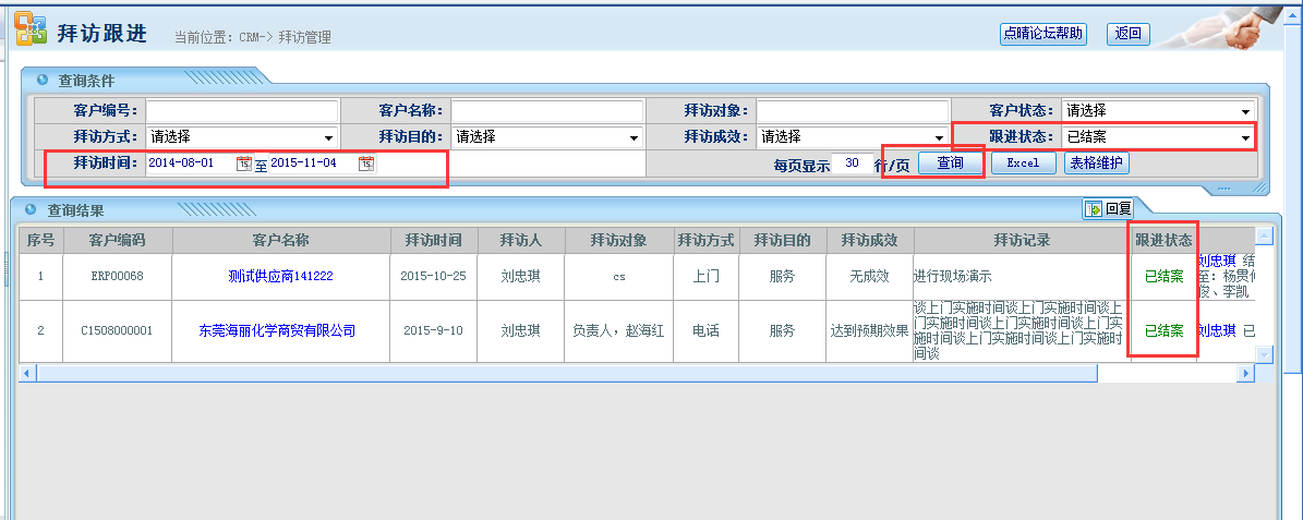 一種是正在跟進(jìn)的記錄、一種是已結(jié)案的記錄,所以在查詢歷史拜訪記錄的時(shí)候注意查詢條件
