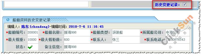 在船舶信息列表中,點(diǎn)取某一船舶名稱,右邊維護(hù)資料方塊則顯示了所選取的船舶詳細(xì)信息。 修改船舶的信息,然后點(diǎn)擊【編輯】保存修改信息。 點(diǎn)擊【刪除】刪除所選取的船舶信息。 3、查看歷史變更記錄