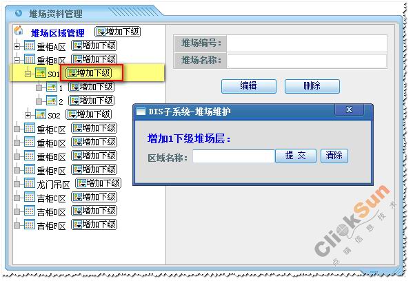 在堆場信息列表中,先展開堆場信息列表,再找到需增加堆場信息的位置,點擊其右邊的【增加下級】,在彈出的增加堆場區(qū)域輸入框中,輸入新增的堆場區(qū)域名稱,點擊【確定】完成增加堆場區(qū)域信息。