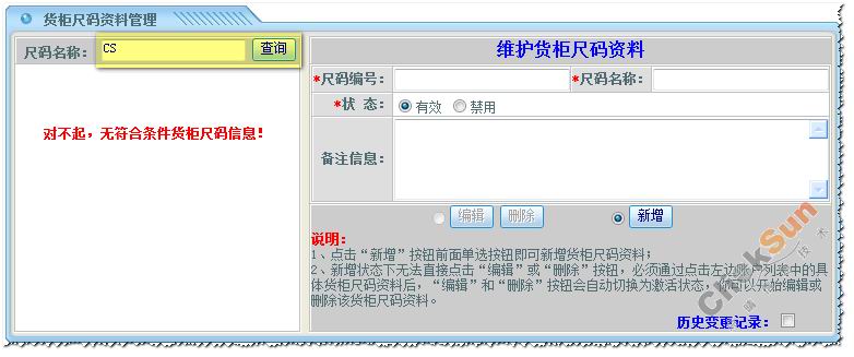 在添加貨柜尺碼信息之前,請先查找系統(tǒng)上是否已經(jīng)存在相應(yīng)的貨柜尺碼名稱,再確定是否需要增加貨柜尺碼信息。如:需添加貨柜尺碼名為“CS”,先查找“CS”,系統(tǒng)顯示找不到相應(yīng)記錄,再進行新增貨柜尺碼信息。然后,在維護資料方塊中,錄入尺碼編號、名稱、狀態(tài)等詳細貨柜尺碼信息,點擊【新增】完成新增貨柜尺碼資料信息。 2、刪改