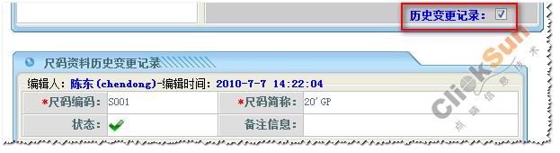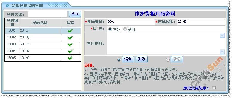 在貨柜尺碼信息列表中,點取某一貨柜尺碼名稱,右邊維護資料方塊則顯示了所選取的貨柜尺碼詳細信息。 修改貨柜尺碼的信息,然后點擊【編輯】保存修改信息。 點擊【刪除】刪除所選取的貨柜尺碼信息。 3、查看歷史變更記錄
