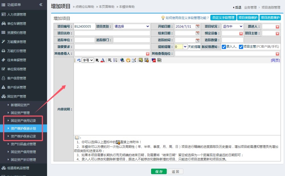 點(diǎn)晴永久免費(fèi)OA中如何對設(shè)備進(jìn)行管理?包括平時的維修記錄及計劃等,是用固定資產(chǎn)模塊嗎?