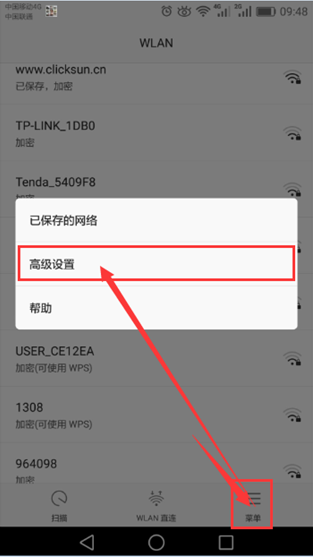 4.1.2、進(jìn)入后點(diǎn)擊“菜單”——選擇“高級(jí)設(shè)置”(部分手機(jī)可直接點(diǎn)擊“高級(jí)設(shè)置”)4.1.3、進(jìn)入菜單點(diǎn)擊“在休眠狀態(tài)下保持WLAN”連接,4.1.4、進(jìn)入菜單后選擇“始終”,如下圖所示: