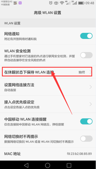 4.1. 點(diǎn)擊“設(shè)置 > WLAN > 高級(jí)設(shè)置 > 在休眠狀態(tài)下保持WLAN連接”。
