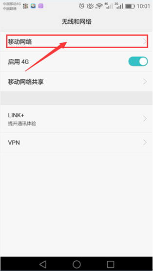 4.2.2、進(jìn)入菜單后——選擇移動(dòng)網(wǎng)絡(luò),4.2.3、選擇“WLAN/移動(dòng)數(shù)據(jù)連接切換提示”,4.2.4、點(diǎn)擊選擇“自動(dòng)使用移動(dòng)數(shù)據(jù)連接”,如下圖所示: