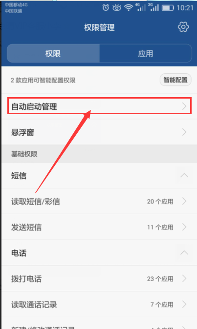 5.1、打開設(shè)置——點(diǎn)擊權(quán)限管理 5.2、進(jìn)入頁面后點(diǎn)擊“自動(dòng)啟動(dòng)管理”5.3、進(jìn)入頁面,選擇“點(diǎn)晴信息通”,設(shè)置啟動(dòng),如下圖: