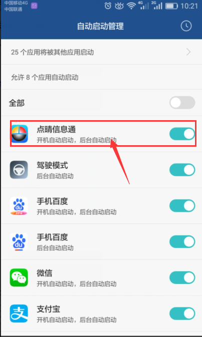 點(diǎn)擊“設(shè)置 > 權(quán)限管理 > 自動(dòng)啟動(dòng)管理(開機(jī)自動(dòng)啟動(dòng))”,將點(diǎn)晴信息通設(shè)置成允許開機(jī)自動(dòng)啟動(dòng)。