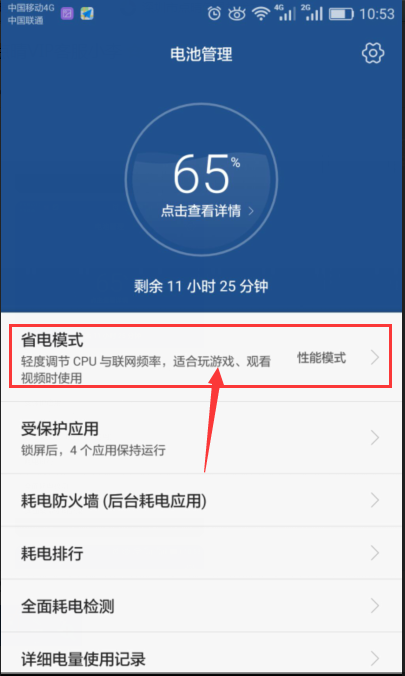 6.1、選擇手機(jī)管家,進(jìn)入頁面 6.2、進(jìn)入頁面——選擇電池管理 6.3、進(jìn)入頁面——點(diǎn)擊“省電模式” 6.4、進(jìn)入頁面——選擇“性能省電或者智能省電”,如下圖所示: