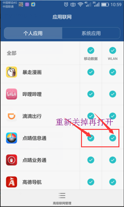 點(diǎn)擊“設(shè)置 > 流量管理 > 應(yīng)用聯(lián)網(wǎng)管理”,找到點(diǎn)晴信息通,然后把點(diǎn)晴信息通的移動(dòng)數(shù)據(jù)和 WLAN 選項(xiàng),重新進(jìn)行勾選。
